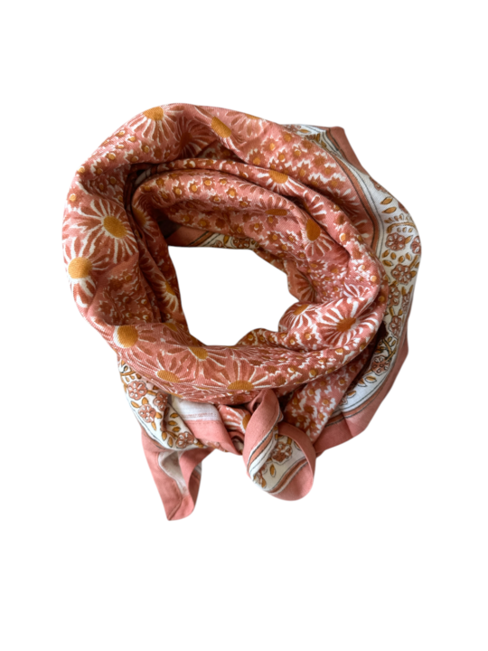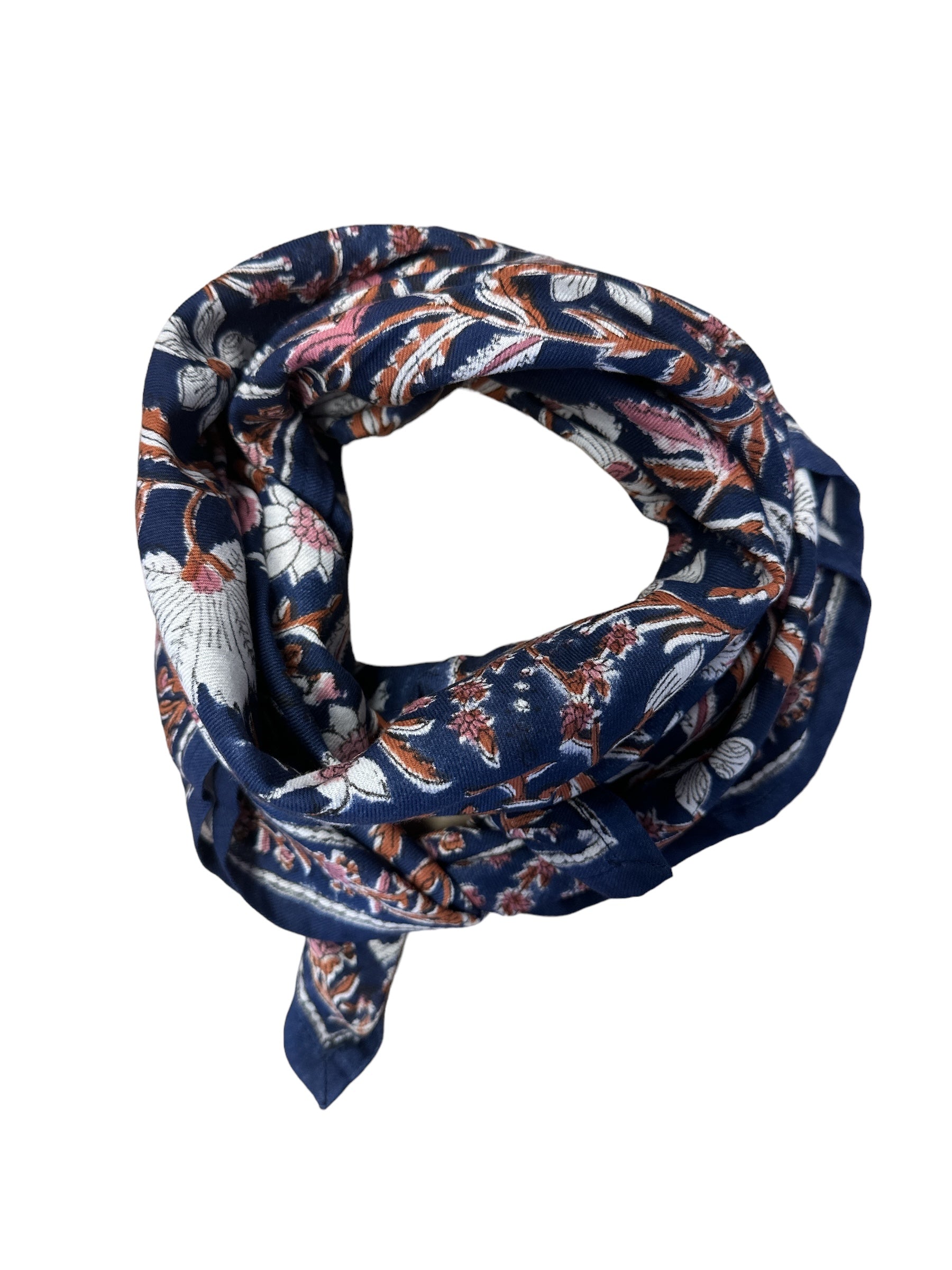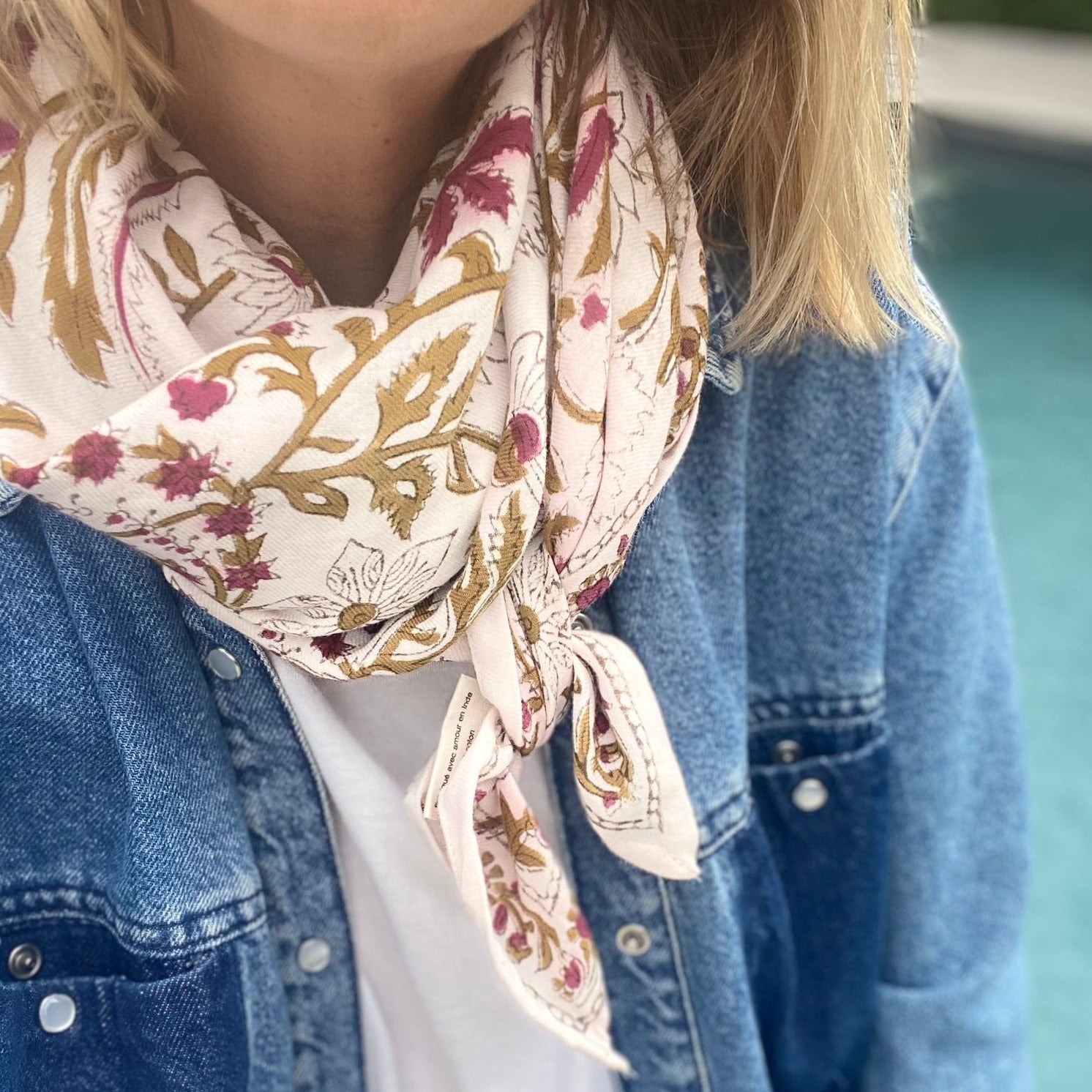 Nos foulards sont imprimés à la main à Jaipur avec la technique traditionnelle du block print. Chaque pièce est unique, avec ses petites irrégularités qui font tout son charme. Comme chaque collection est réalisée en série limitée, les couleurs varient d’une production à l’autre : votre duo est vraiment exclusif !