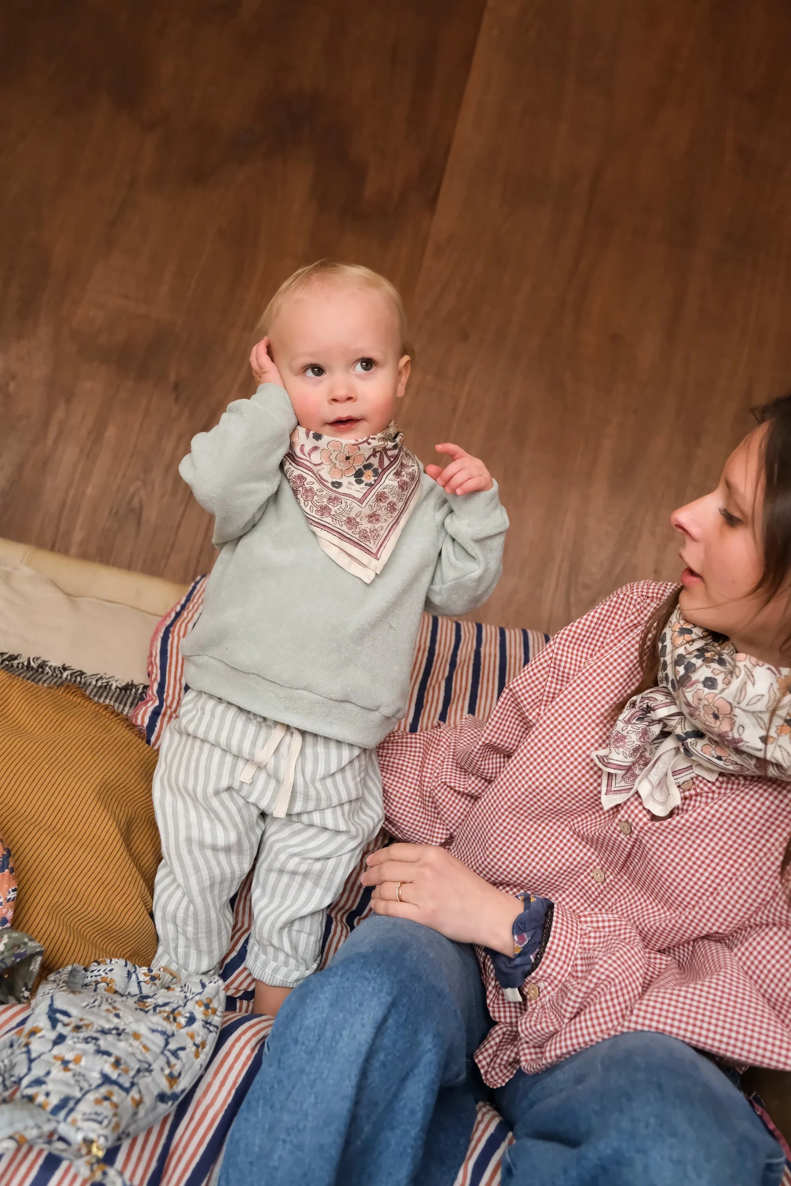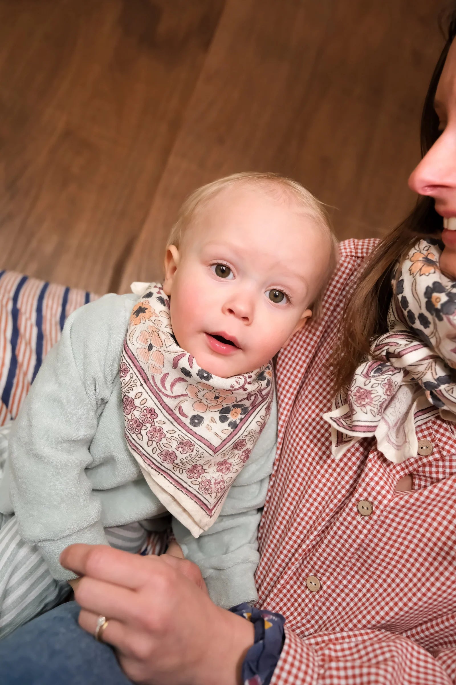 Un foulard pour maman (100x100 cm) et un foulard pour enfant (50x50 cm) : l’accessoire idéal pour créer des looks matchy-matchy plein de style et de tendresse.