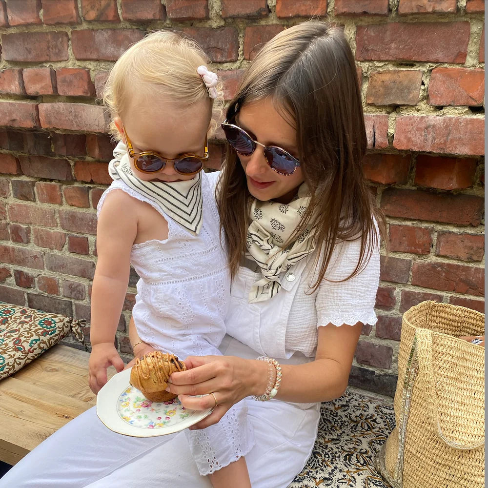 Un foulard pour maman (100x100 cm) et un foulard pour enfant (50x50 cm) : l’accessoire idéal pour créer des looks matchy-matchy plein de style et de tendresse.