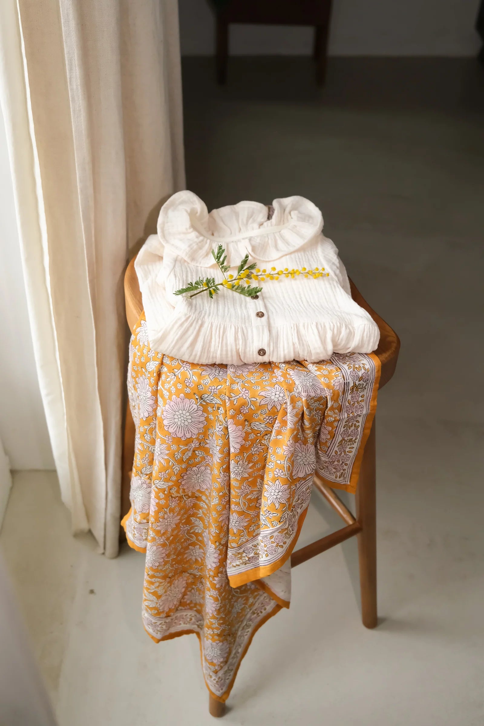 Nos foulards sont imprimés à la main à Jaipur avec la technique traditionnelle du block print. Chaque pièce est unique, avec ses petites irrégularités qui font tout son charme. Comme chaque collection est réalisée en série limitée, les couleurs varient d’une production à l’autre : votre duo est vraiment exclusif !