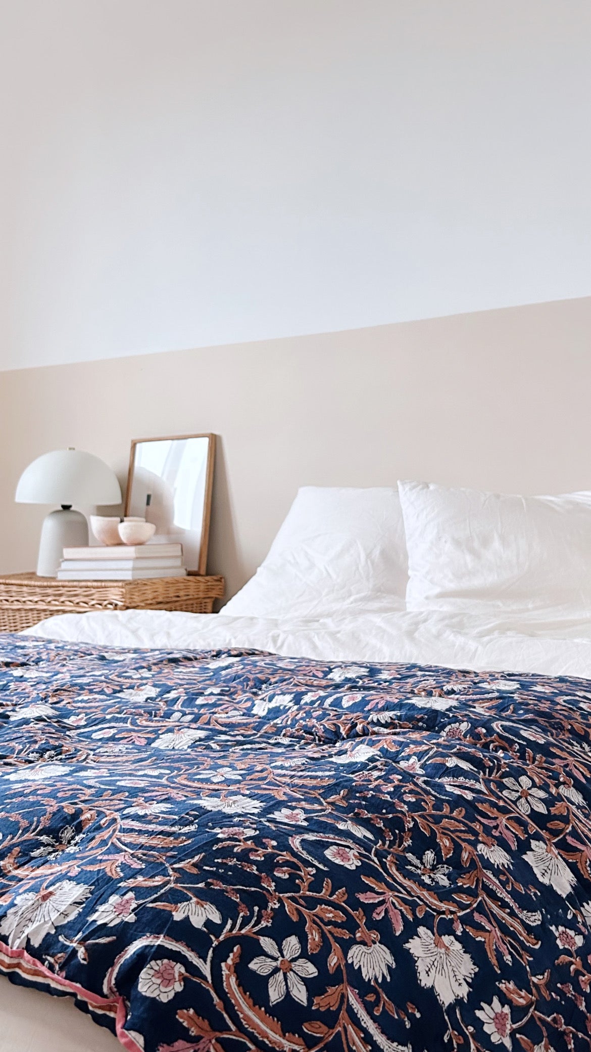 Nos créations prennent ensuite vie dans nos ateliers partenaires en Inde, certifiés et reconnus pour leur savoir-faire ancestral. Là-bas, des artisans perpétuent l’art du blockprint, une technique traditionnelle d’impression au tampon de bois sculpté à la main. Chaque geste, précis et patient, confère au tissu un caractère singulier, empreint d’authenticité et d’irrégularités précieuses qui rendent chaque pièce unique.