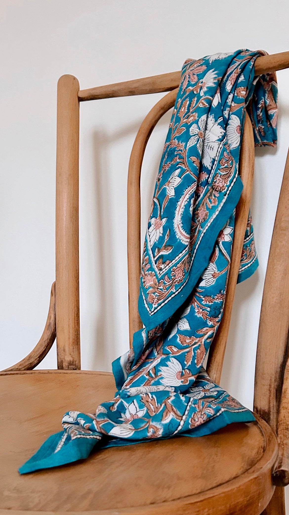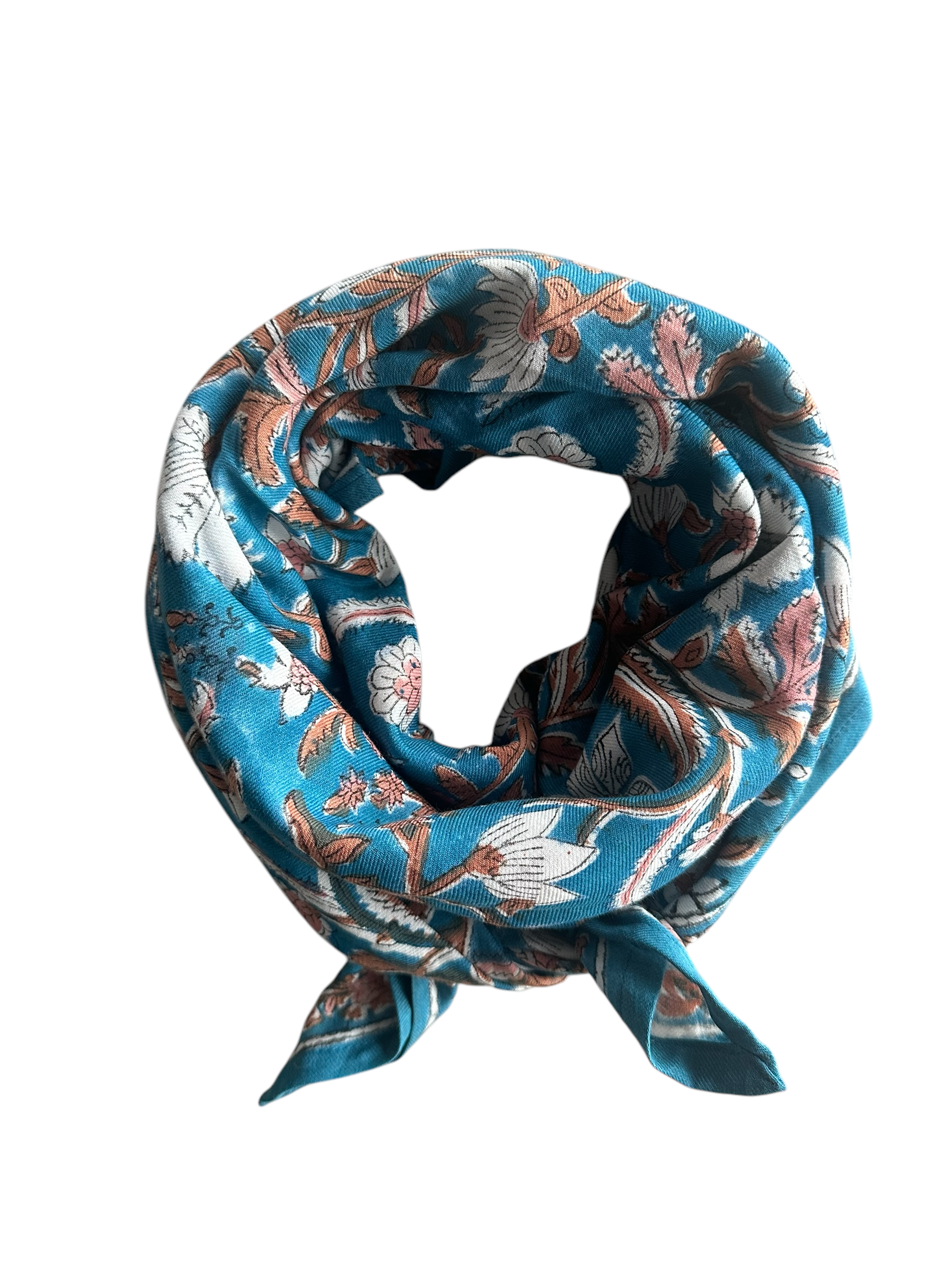 Imprimés à la main à Jaipur avec la technique traditionnelle du block print, chaque foulard se distingue par ses nuances uniques obtenues grâce à des pigments naturels. De petites irrégularités peuvent apparaître, signe de leur fabrication artisanale et de leur authenticité.