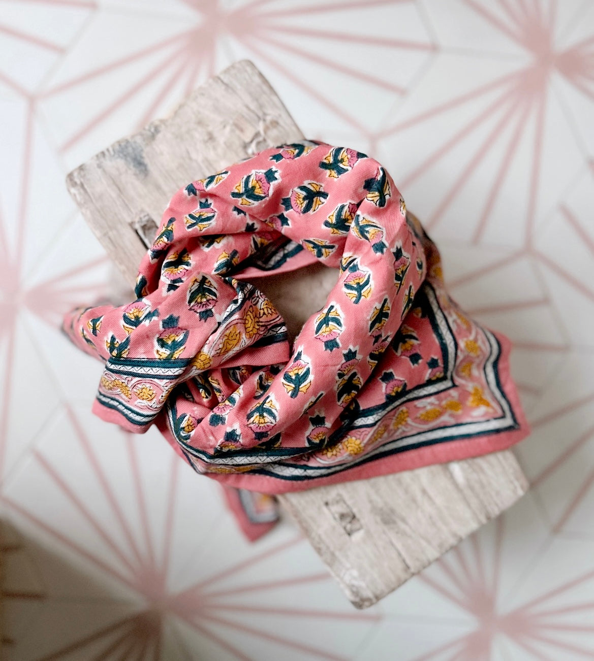 Imprimés à la main à Jaipur avec la technique traditionnelle du block print, chaque foulard se distingue par ses nuances uniques obtenues grâce à des pigments naturels. De petites irrégularités peuvent apparaître, signe de leur fabrication artisanale et de leur authenticité.