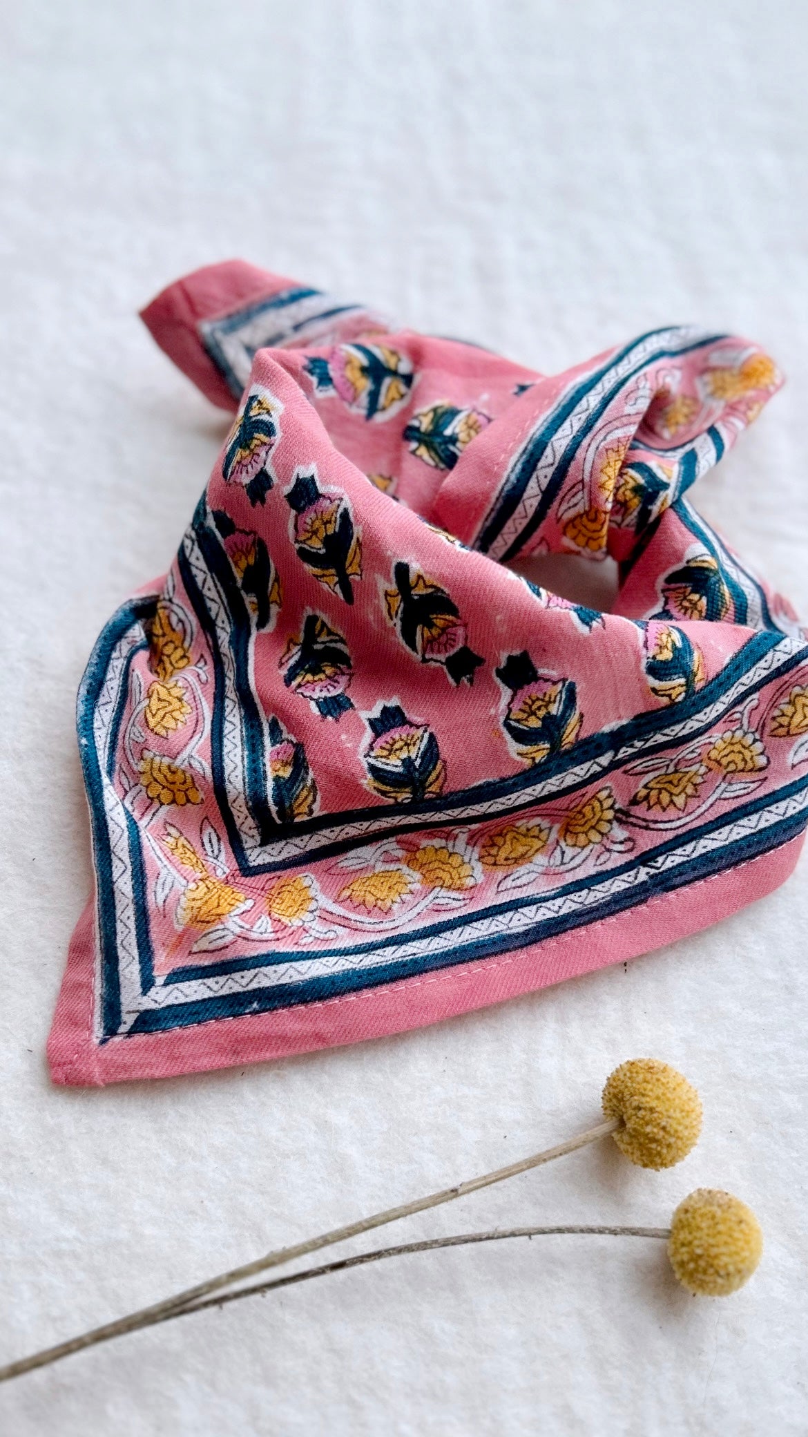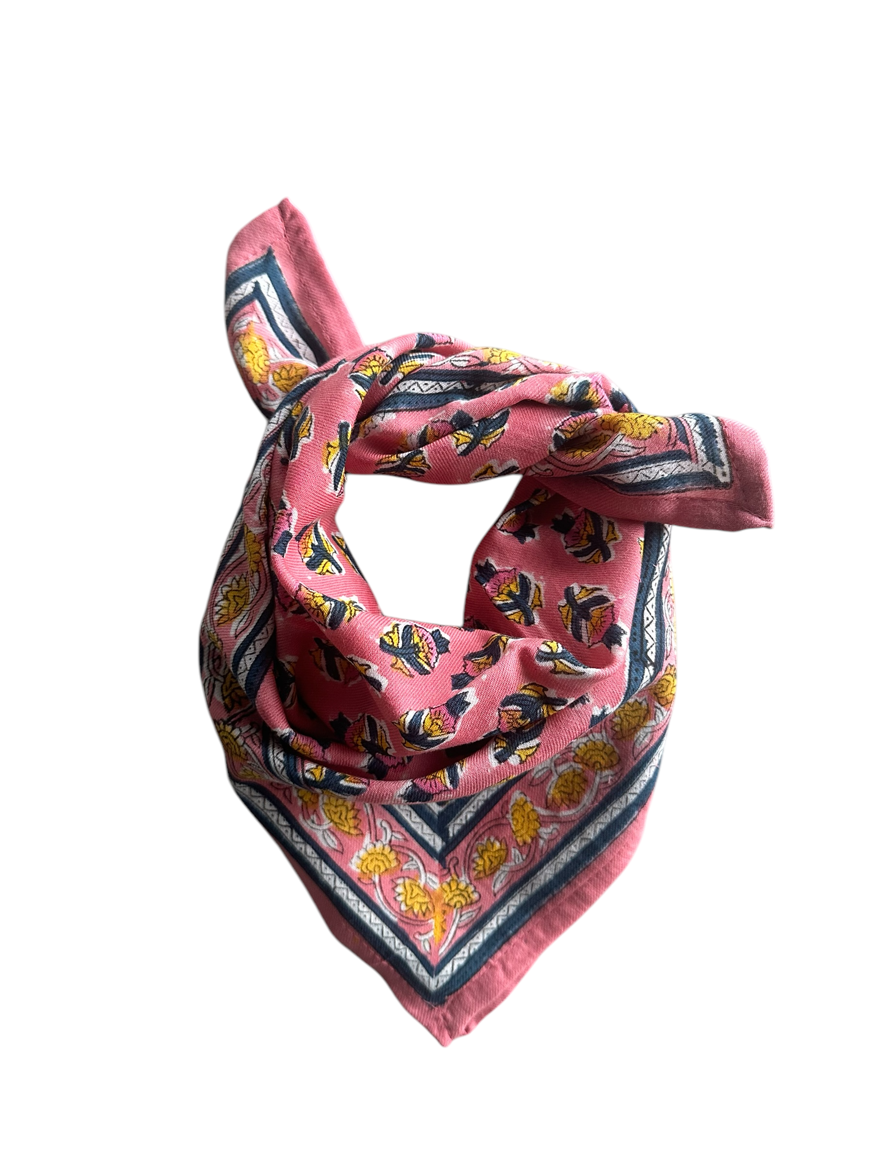 Chaque foulard est imprimé artisanalement à Jaipur avec la technique traditionnelle du block print. Les motifs sont appliqués à la main, ce qui rend chaque pièce unique. De petites variations de couleurs peuvent apparaître, et c’est ce qui fait tout leur charme.