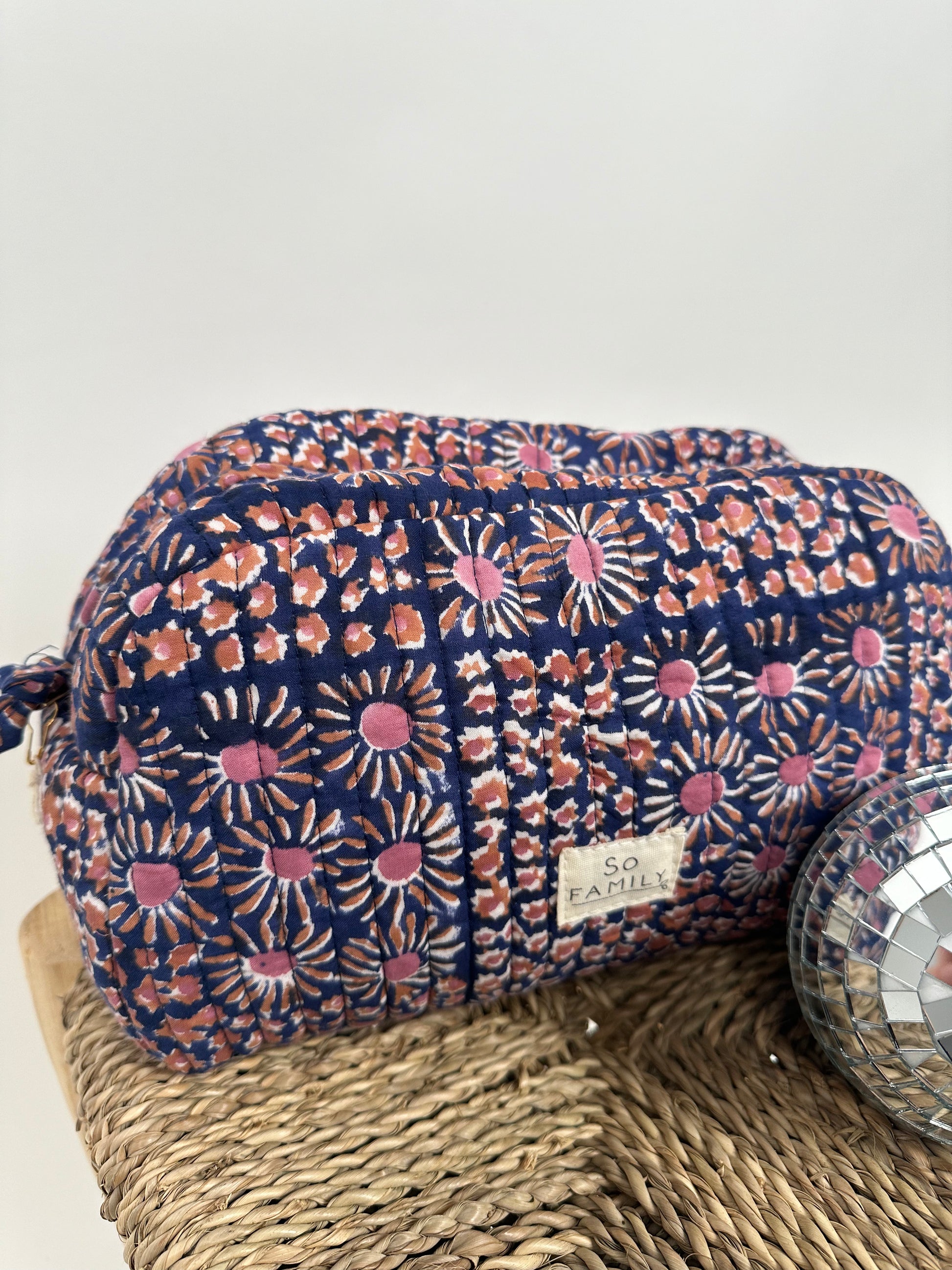 Confectionnée artisanalement à Jaipur, en Inde, selon la technique traditionnelle du block print, chaque trousse est unique.