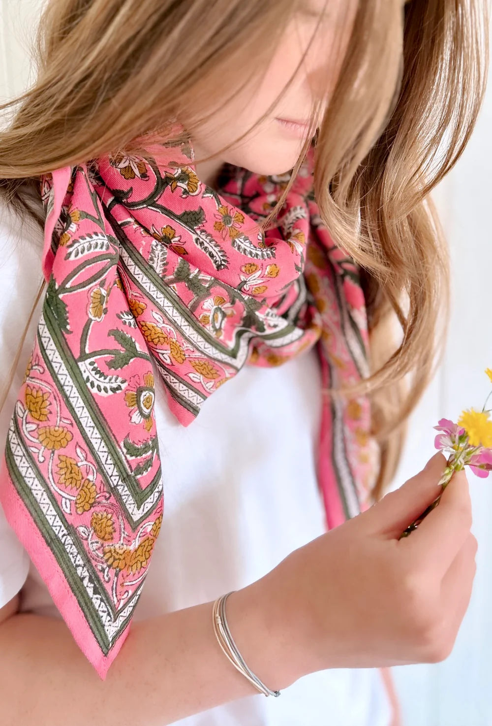 Nos foulards sont imprimés à la main à Jaipur avec la technique traditionnelle du block print. Chaque pièce est unique, avec ses petites irrégularités qui font tout son charme. Comme chaque collection est réalisée en série limitée, les couleurs varient d’une production à l’autre : votre duo est vraiment exclusif !