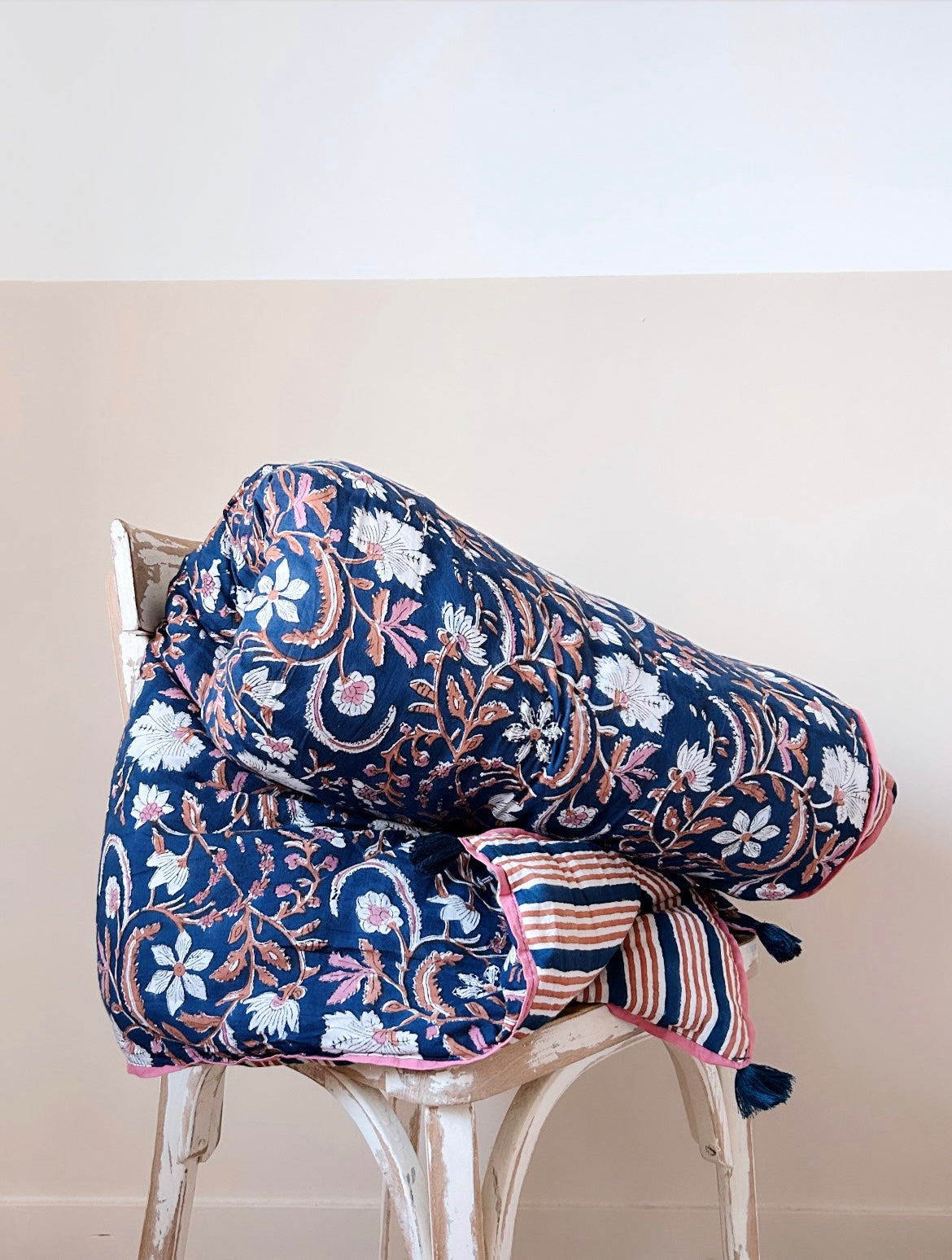 Cet édredon en pur coton vous offre un confort optimal avec une face imprimée et une face rayée, agrémentée de pompons à chaque coin et d'un piping délicat tout autour.