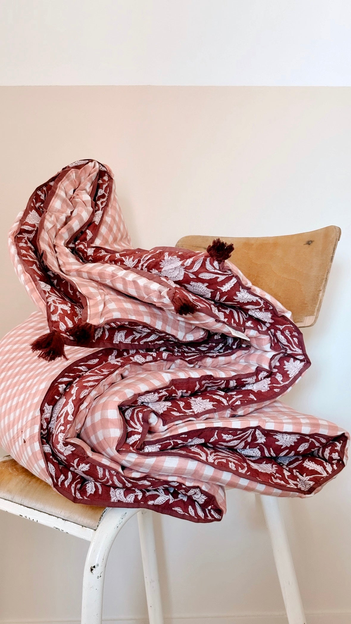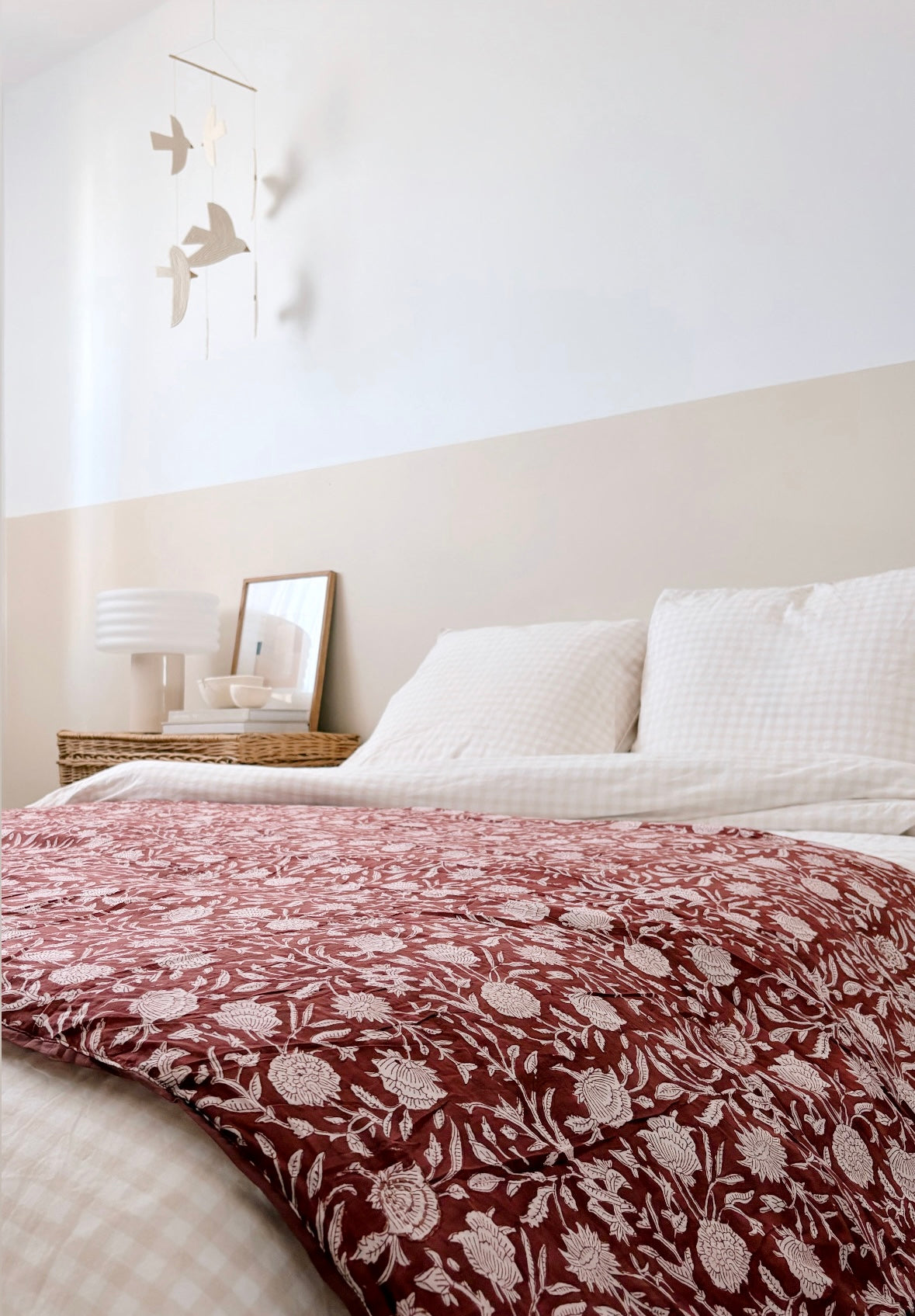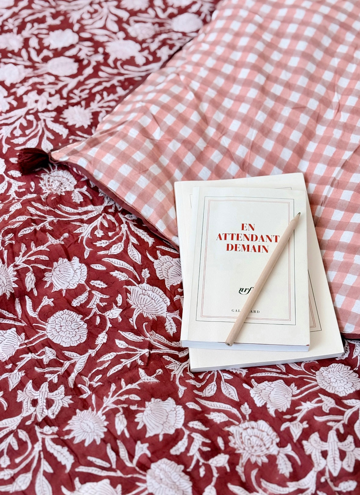 Nos créations prennent ensuite vie dans nos ateliers partenaires en Inde, certifiés et reconnus pour leur savoir-faire ancestral. Là-bas, des artisans perpétuent l’art du blockprint, une technique traditionnelle d’impression au tampon de bois sculpté à la main. Chaque geste, précis et patient, confère au tissu un caractère singulier, empreint d’authenticité et d’irrégularités précieuses qui rendent chaque pièce unique.