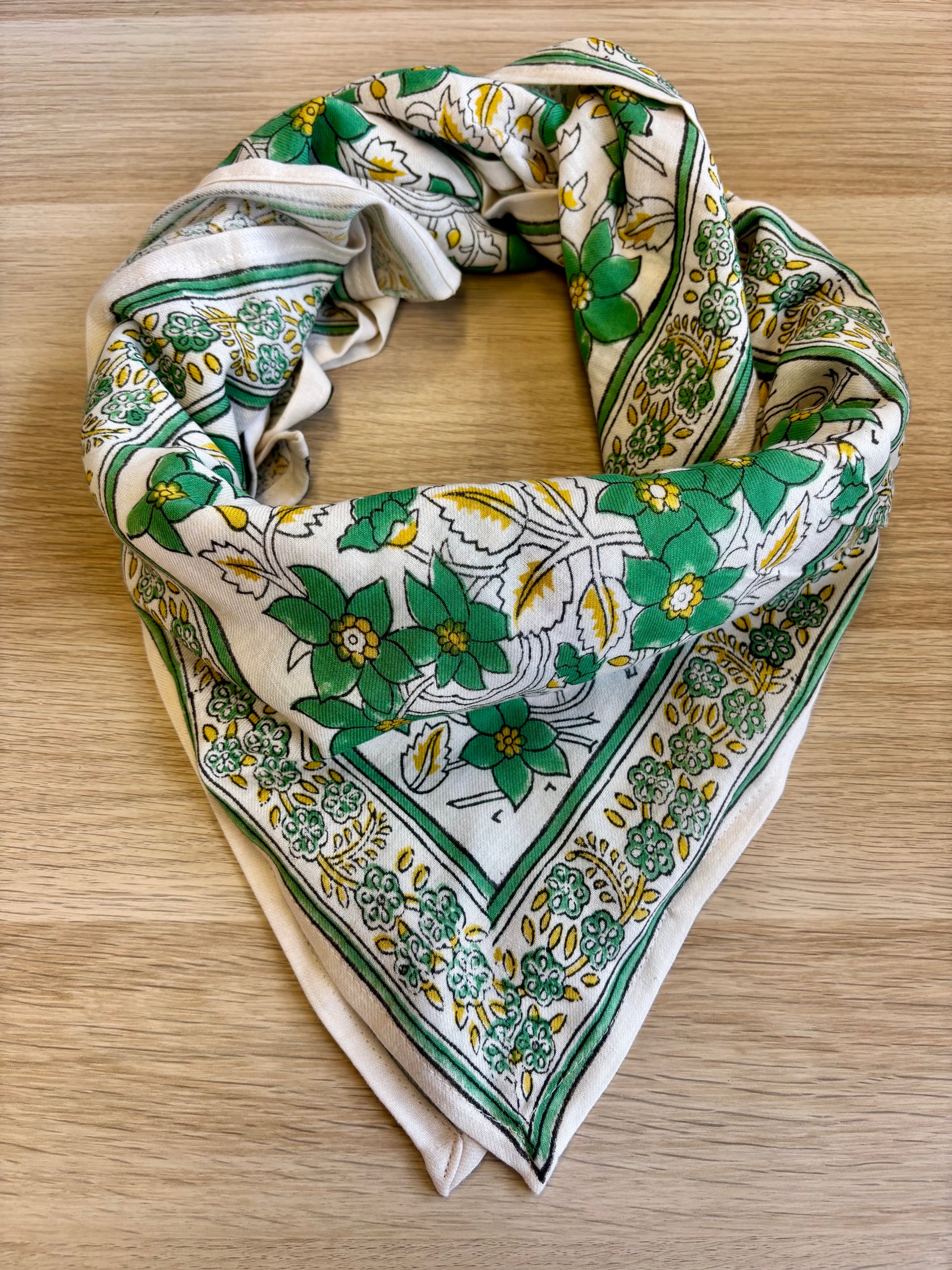 Imprimés à la main à Jaipur avec la technique traditionnelle du block print, chaque foulard se distingue par ses nuances uniques obtenues grâce à des pigments naturels. De petites irrégularités peuvent apparaître, signe de leur fabrication artisanale et de leur authenticité.