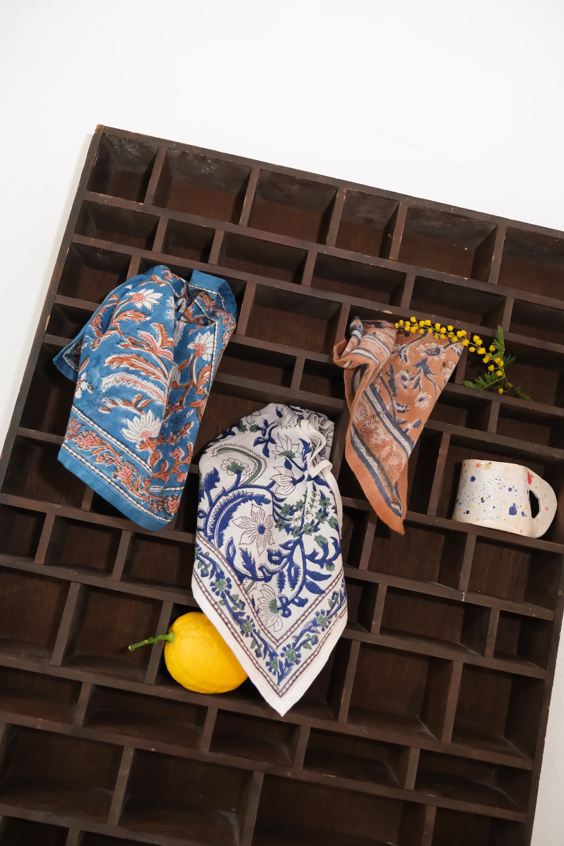 Chaque foulard est imprimé artisanalement à Jaipur avec la technique traditionnelle du block print. Les motifs sont appliqués à la main, ce qui rend chaque pièce unique. De petites variations de couleurs peuvent apparaître, et c’est ce qui fait tout leur charme.