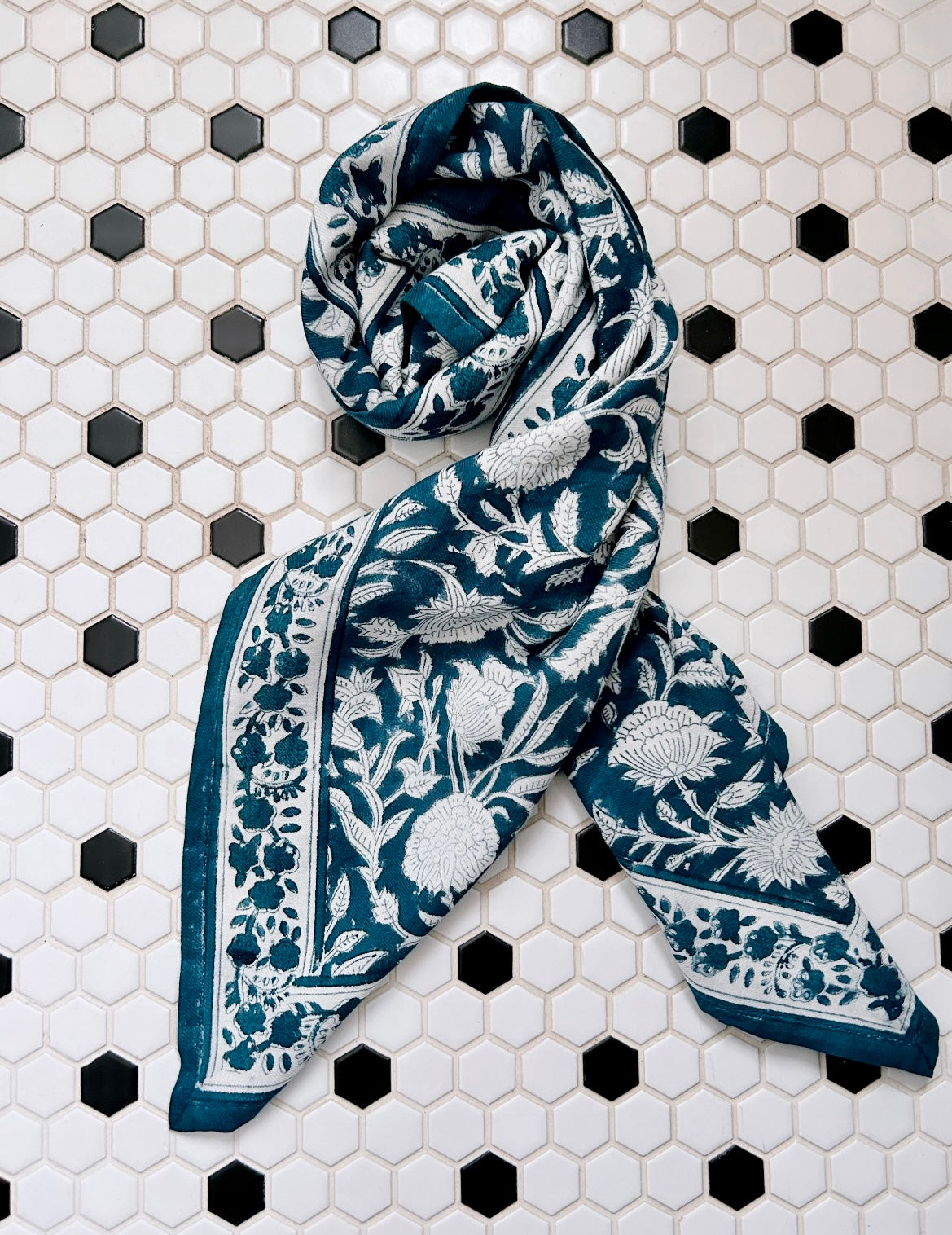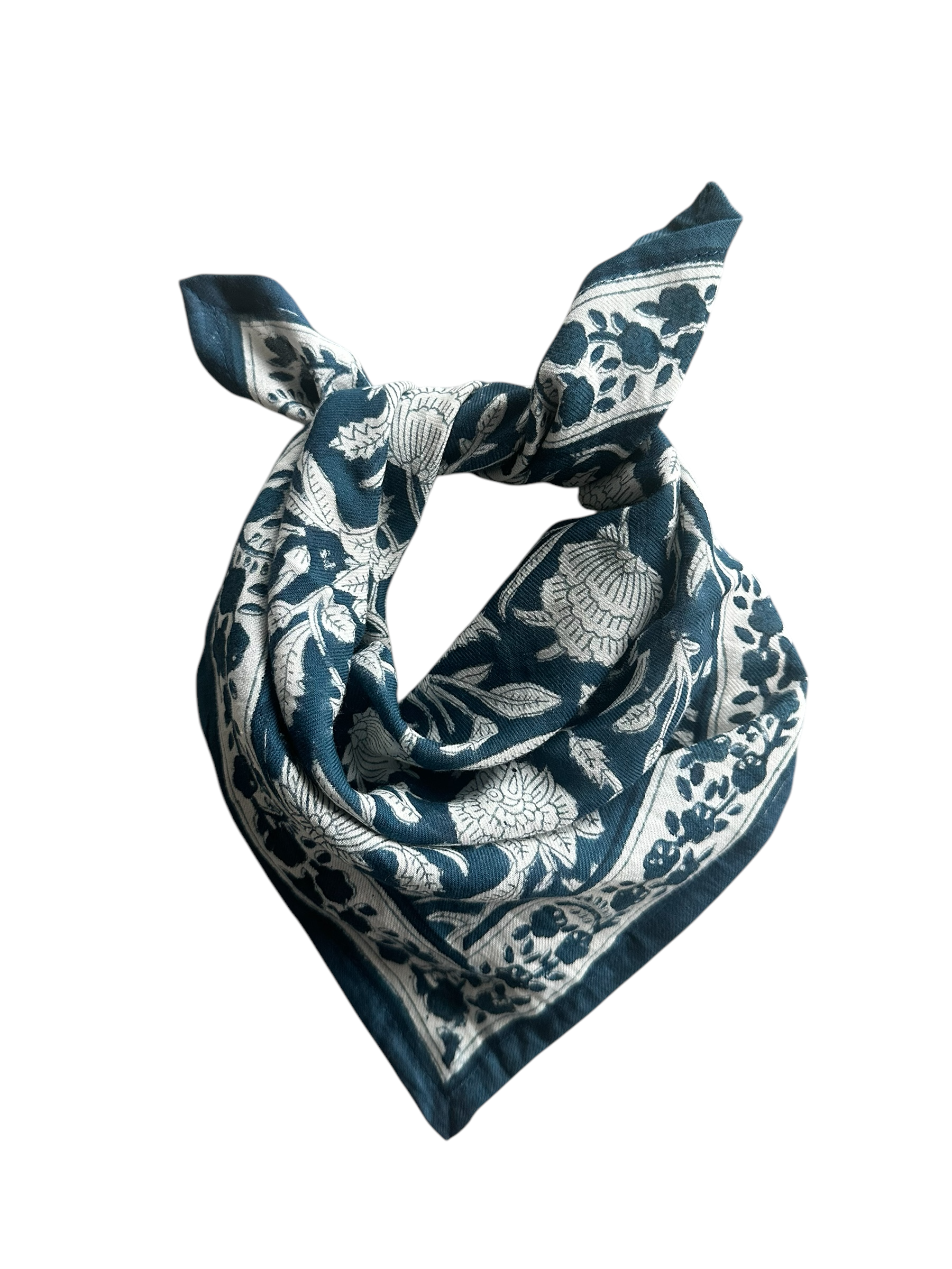 Chaque foulard est imprimé artisanalement à Jaipur avec la technique traditionnelle du block print. Les motifs sont appliqués à la main, ce qui rend chaque pièce unique. De petites variations de couleurs peuvent apparaître, et c’est ce qui fait tout leur charme.