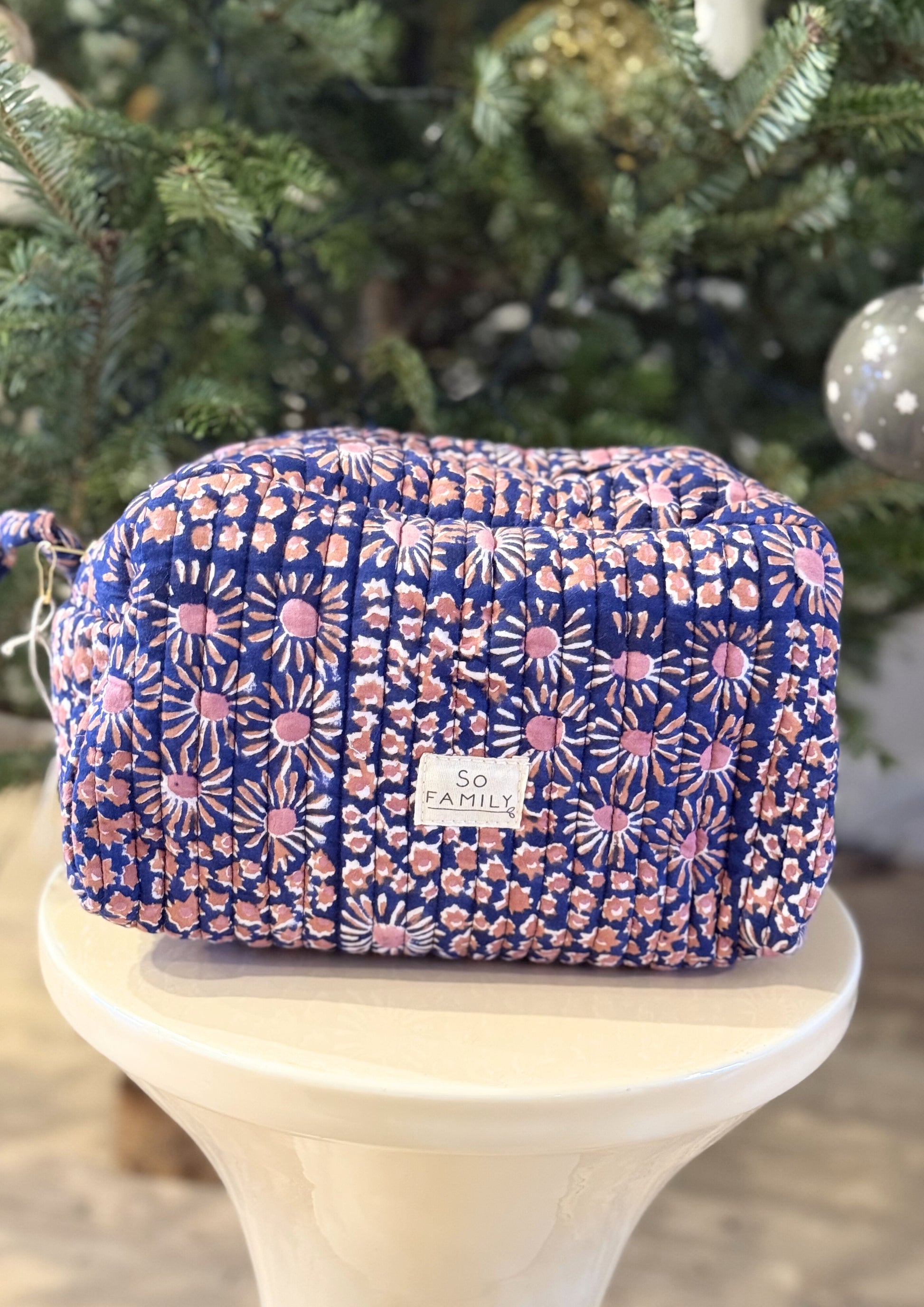 Confectionnée artisanalement à Jaipur, en Inde, selon la technique traditionnelle du block print, chaque trousse est unique.