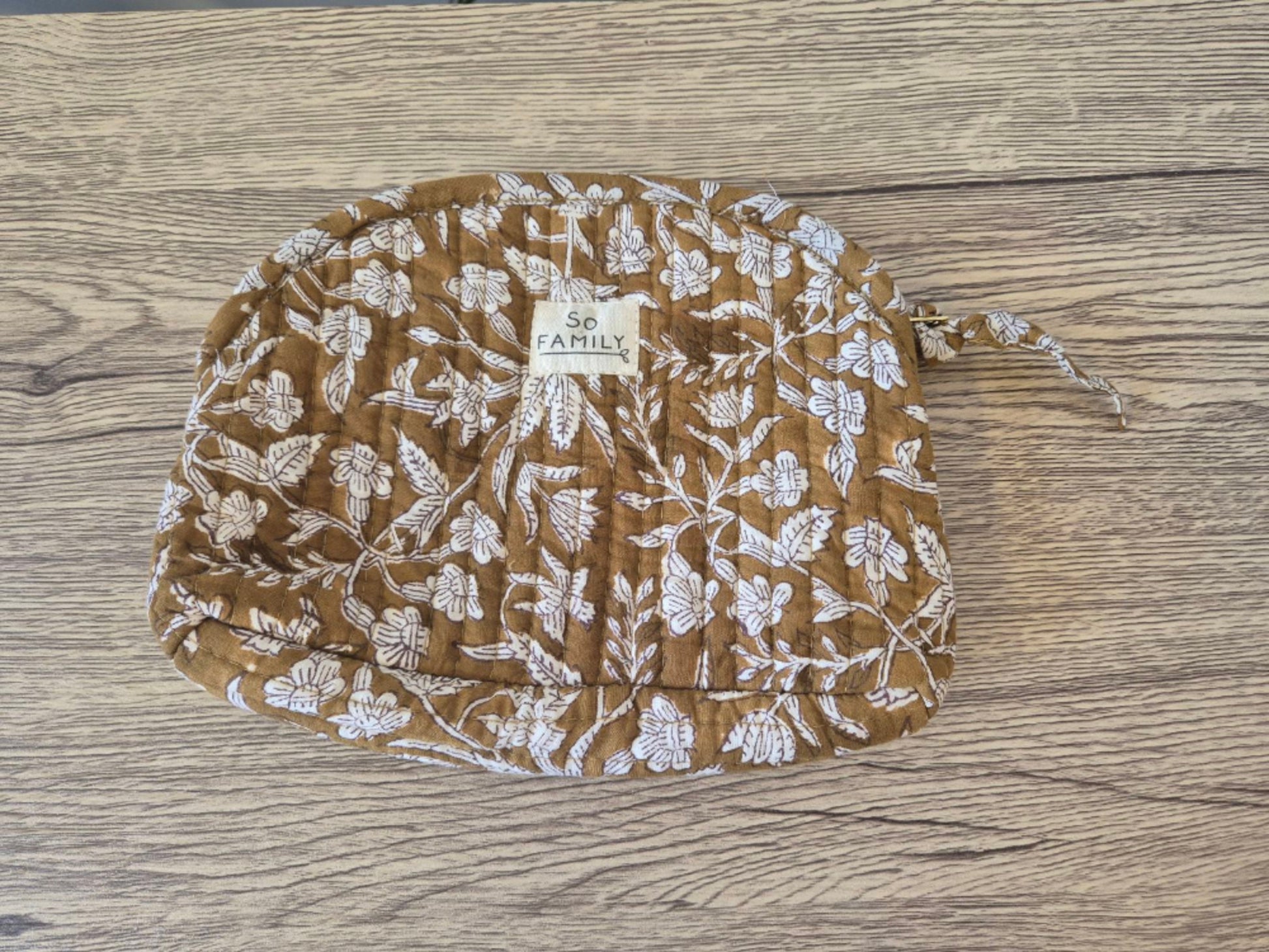 Confectionnée artisanalement à Jaipur, en Inde, selon la technique traditionnelle du block print, chaque trousse est unique.