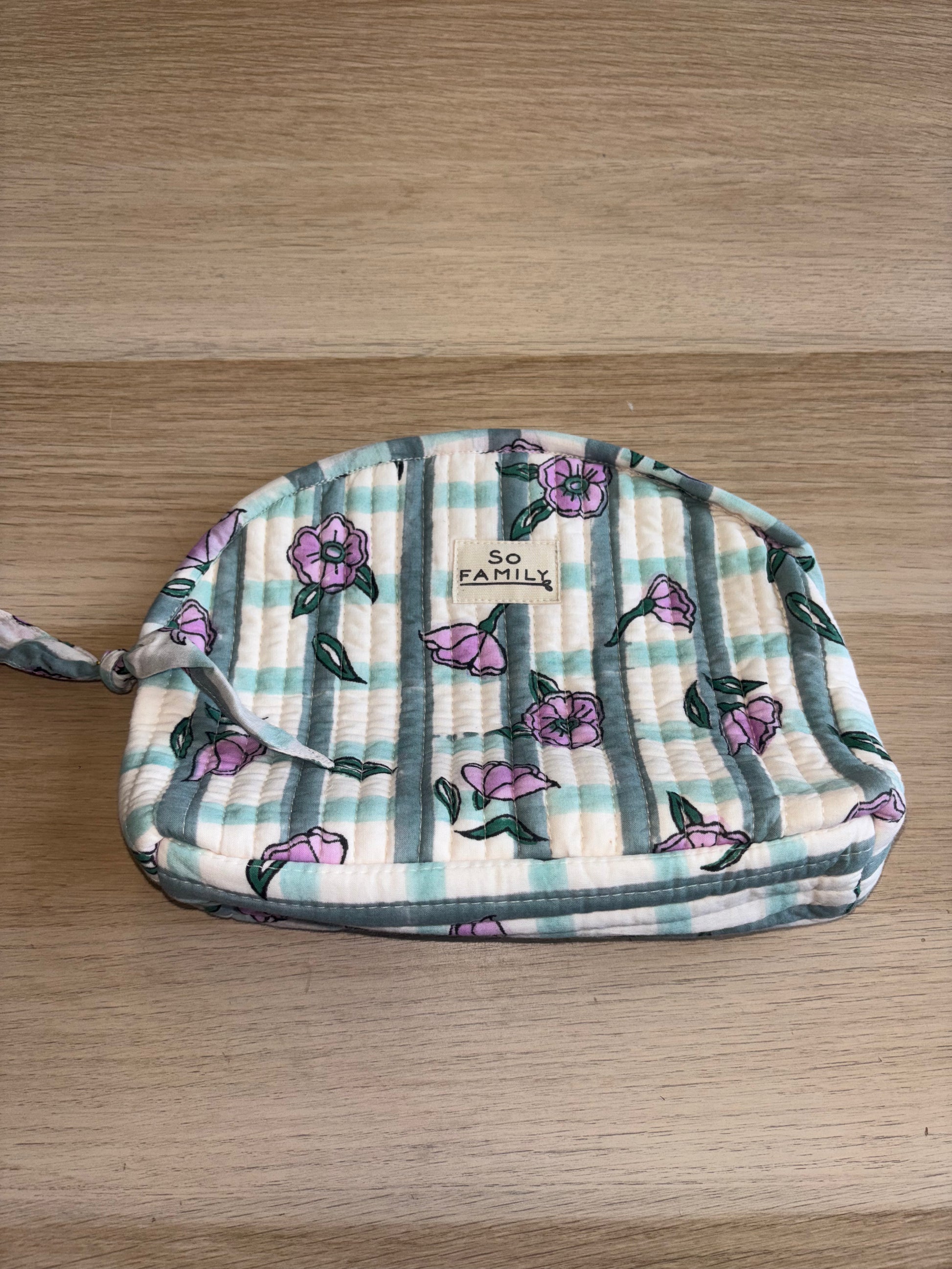 Confectionnée artisanalement à Jaipur, en Inde, selon la technique traditionnelle du block print, chaque trousse est unique.