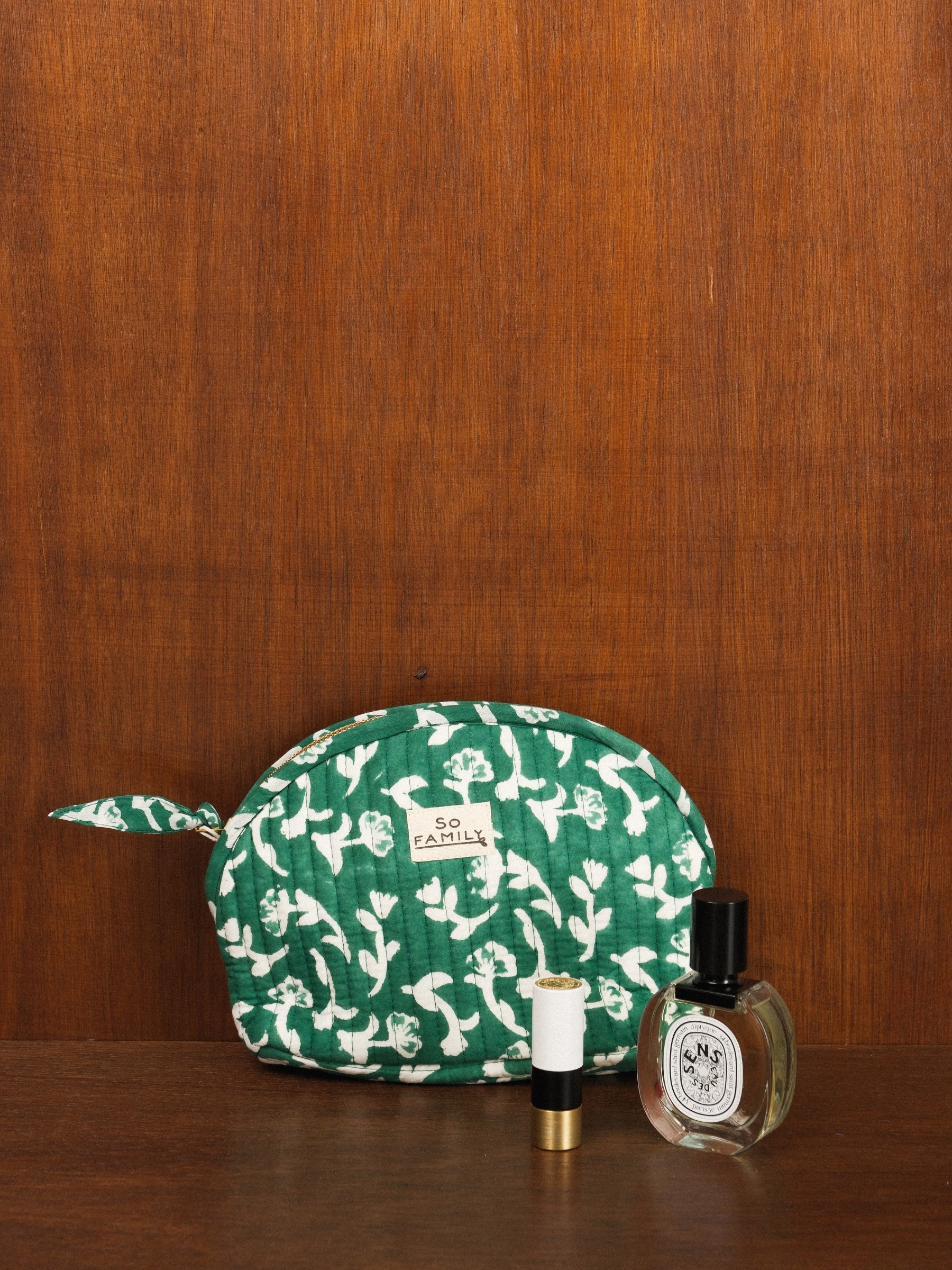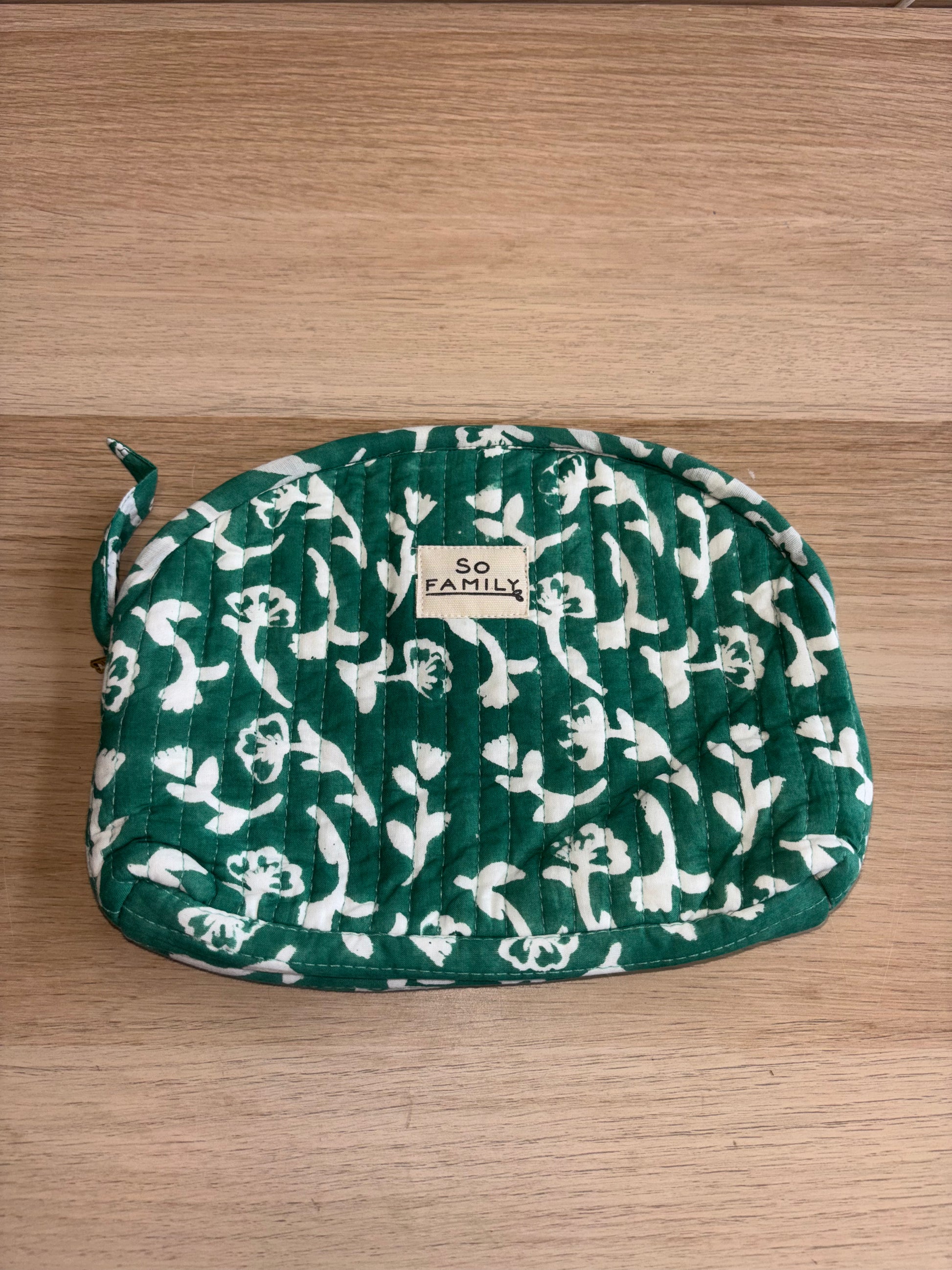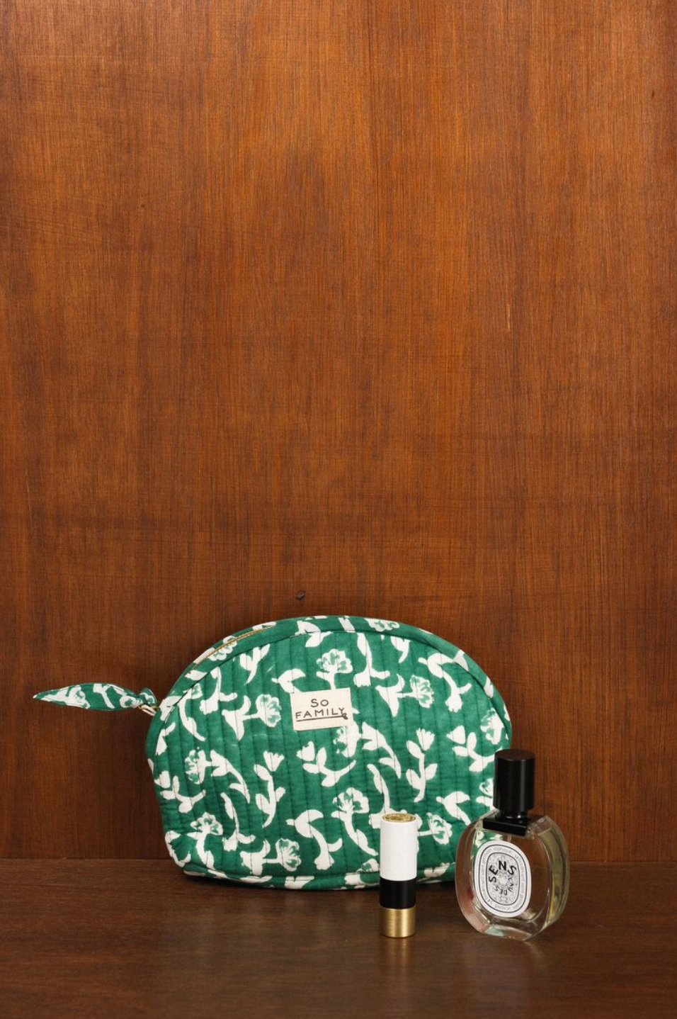Confectionnée artisanalement à Jaipur, en Inde, selon la technique traditionnelle du block print, chaque trousse est unique.