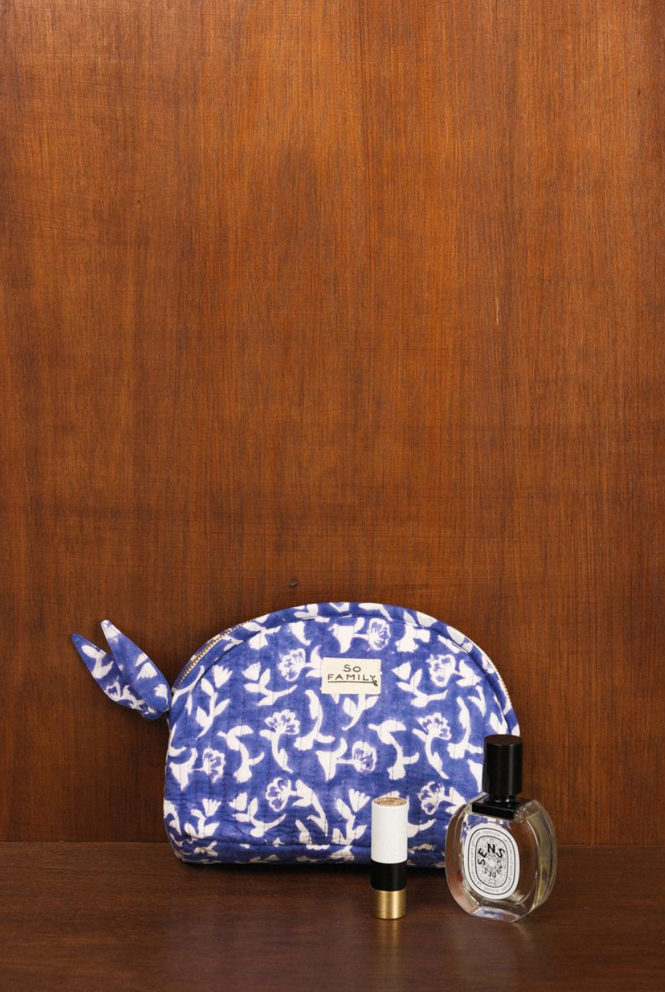 Confectionnée artisanalement à Jaipur, en Inde, selon la technique traditionnelle du block print, chaque trousse est unique.